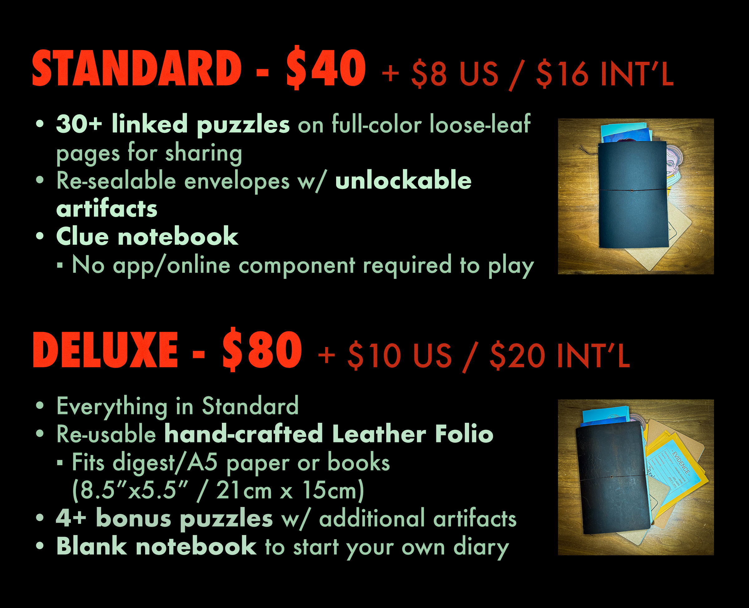 The game includes the diary, ephemera, and a set of envelopes containing additional artifacts to unlock. You will need to think laterally to solve the mystery of Mary's disappearance. In case players get stuck, clues are provided in the accompanying case notes of Detective Mike Ross (no online component is required to play).